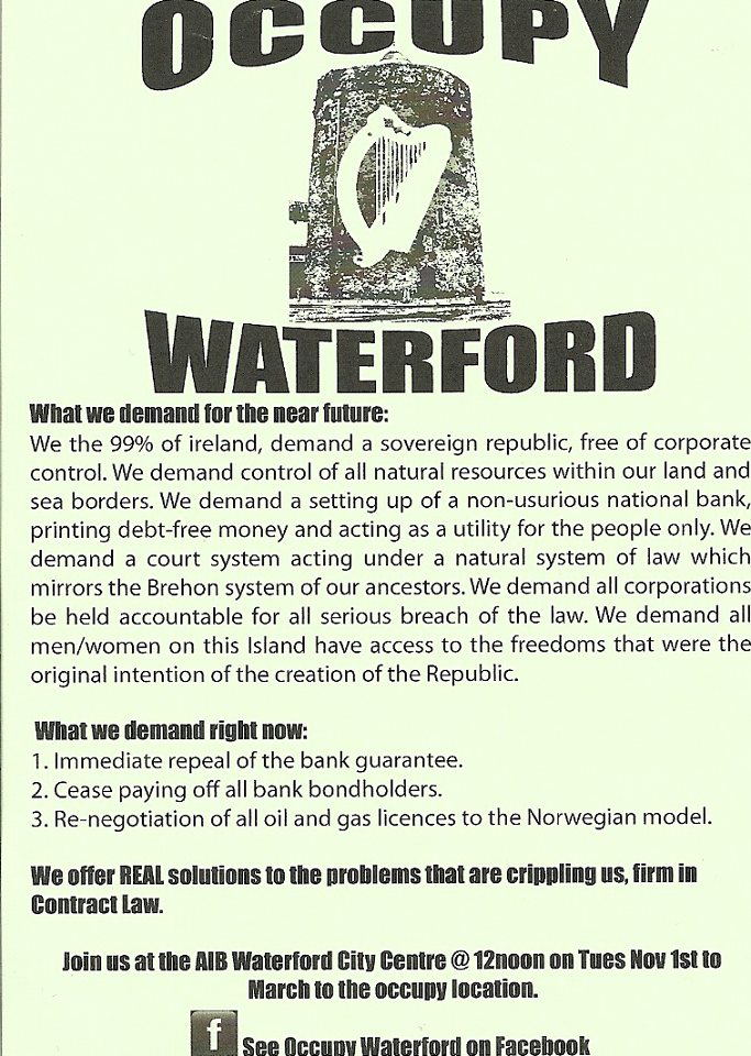 Occupy Waterford is not suggesting that everyone in the country agrees with the demands on its flyer but hopes it will point us all in the right direction to get the debate flowing about how we can really resolve the issues that are hurting us the most at present. This movement is not going away, all the different groups are being run autonomously globally, which is the way it should be, but we are all reaching out to each other with help and advice and we share very similar organisational structures and ideologies.