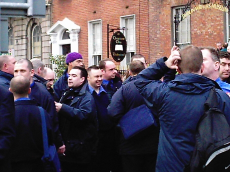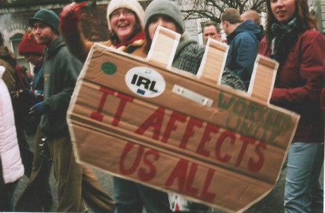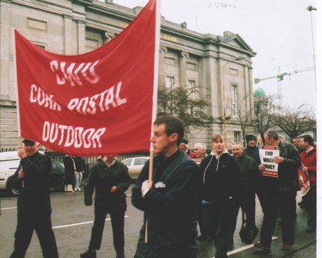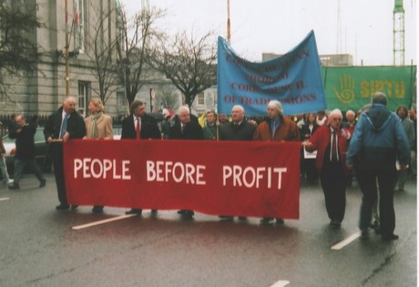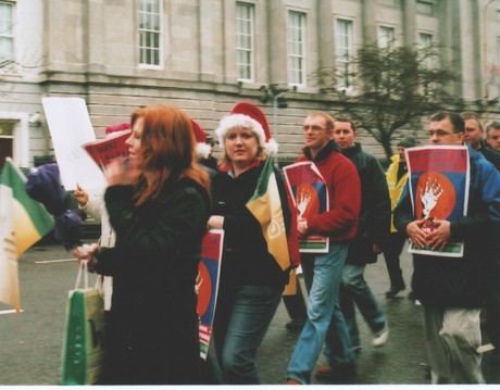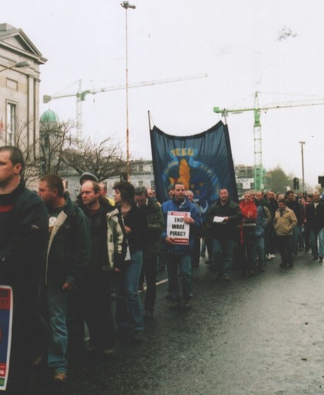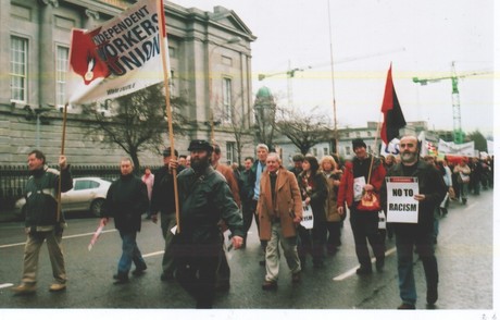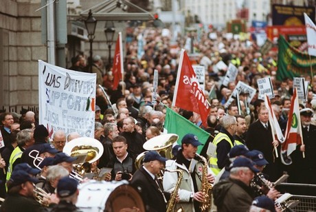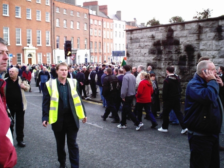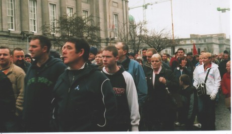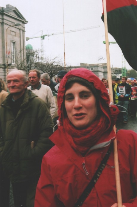"In our thousands we fell in behind the banners of our unions. TEEU, SIPTU, IMPACT, IWU, CWU. etc a few Starry Ploughs, Anarchist flags, Socialist party banner, Labour, Shinners.... The speakers on Connolly Hall played Luke Kelly. People shook hands met old friends made new ones. Men and women who had know hard struggle to beat poverty and oppression mingled with the children of the Celtic Tiger. There was grim determination on faces all around."