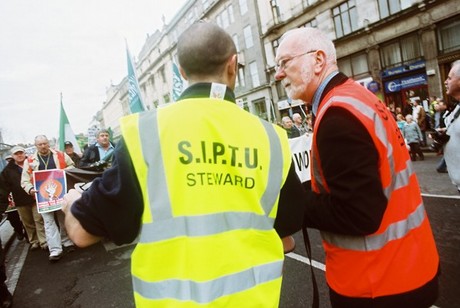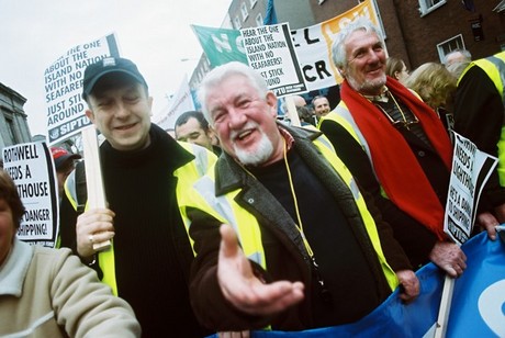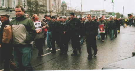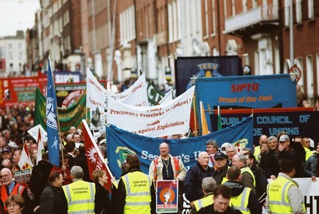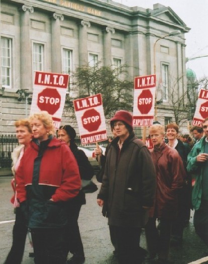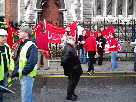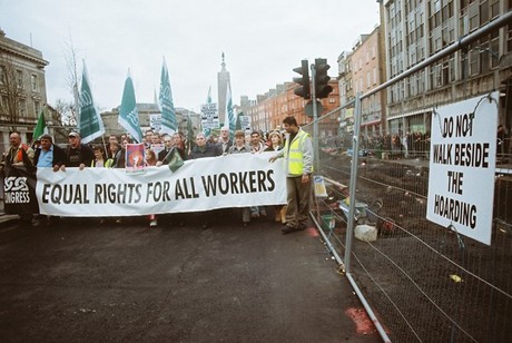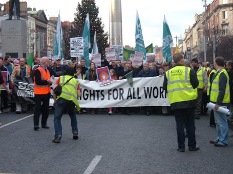 From the banners: "Unity is Strength ... "Polish against exploitation" ... "divided we are sunk" ... "Sink That Idea - 3 euro ph" ... "Bertie We're Not Impressed" ... "INTO Stop Exploitation" ... "Belfast Unemployed Centre .. Health Dignity Peace" ... "An Injury to one is the Concern of All" ...