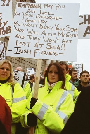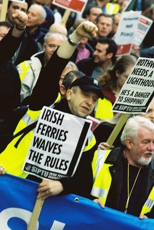 ... were so happy to see close to 200,000 people supporting the Irish Ferries workers. Pity it didn't lead them to support the workers themselves. The result: Irish Ferries can re-flag "our " ships; pay any new employees the minimum wage for 3 years; and then tear up their obligations from their new foreign base.