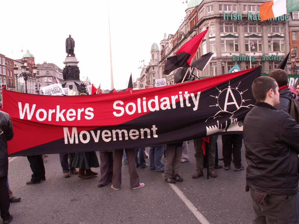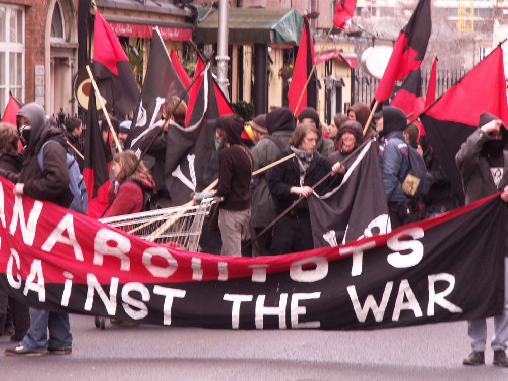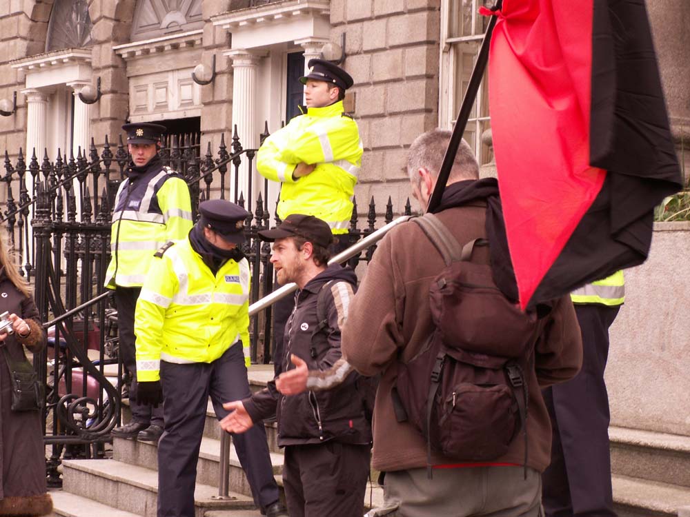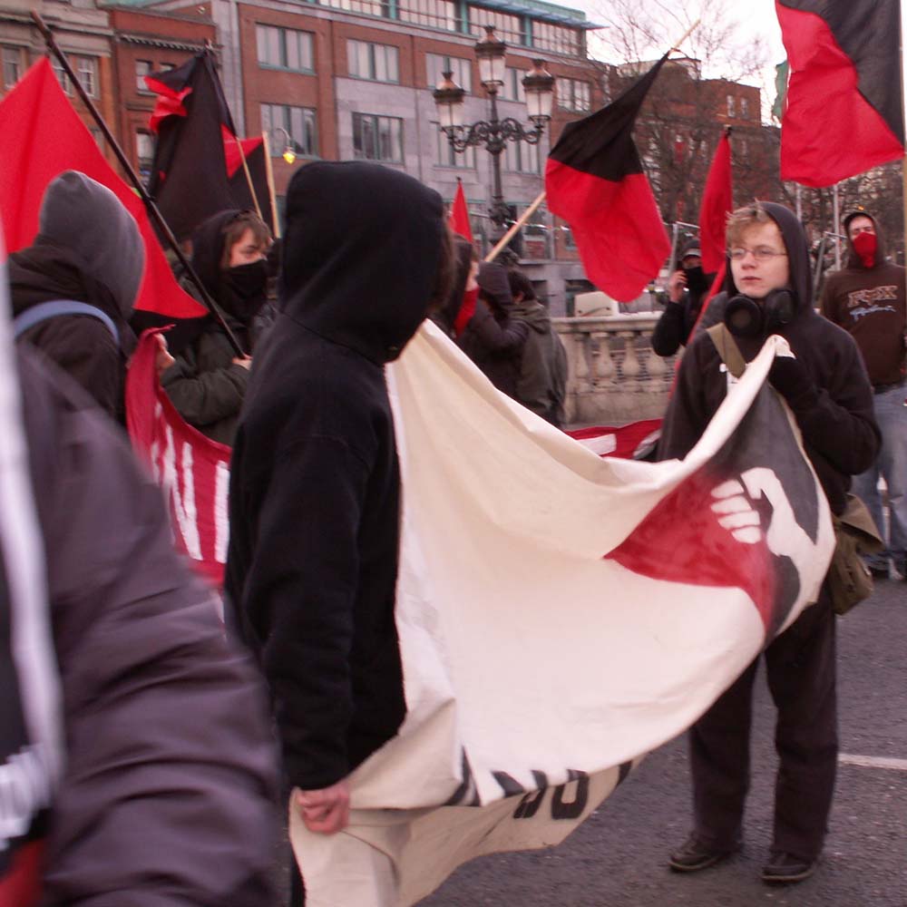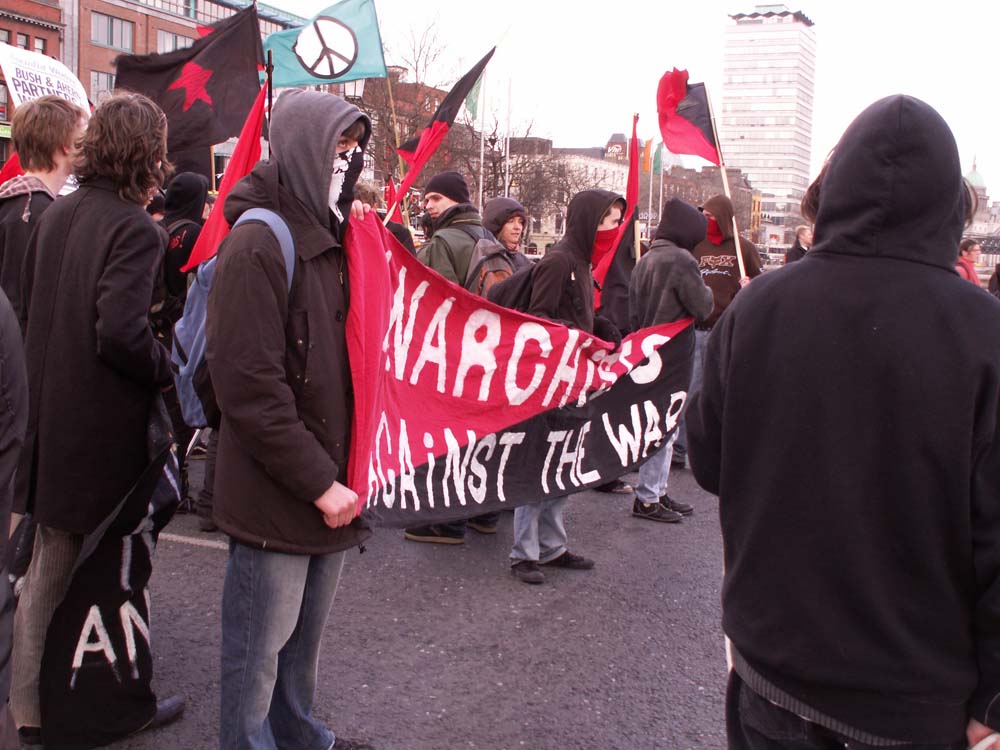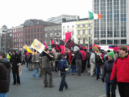 The anarchists marching off up Nassau Street was the strangest thing. All I saw was the march turning to the right at Grafton Street (almost everybody) and off in the distance heading up Nassau Street were some anarchists with their banners and flags flying. Nobody around me knew what they were up to or where they were going! I didn't see any leaflets promoting a distinct action and remain completely puzzled. One of the postings above says they headed off to the Dail or the Dept of Foreign Affairs.