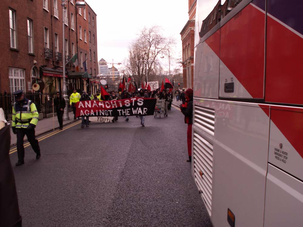 The anarchist march broke away at Nassua street while the main march was doubling back on itself to listen to speeches outside the GPO. The department of transport and deptartment of justice were called at before the crowd gathered in St. Stephens green for an open anti-war discussion.