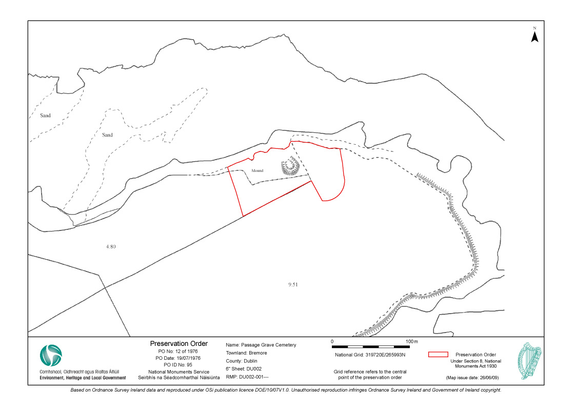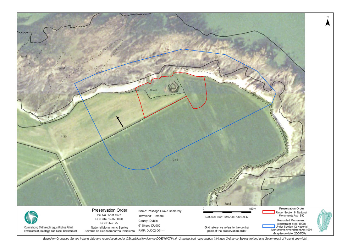 I have obtained a PDF map of the area covered by the Preservation Order 1976 . It shows that the Preservation Order applies to the main mound and one other satellite mound only- not the entire complex. According to the Archaeologist employed by the Dept of the Environment Tombs 1-4 are contained within the main mound. This seems extraordinary to me ( I am not an Archaeologist) as even to the naked eye it is evident that what he has termed " outcrops" in his report are indeed mounds and are categorised as Passage Tombs in the Recorded Monuments and Places. The co ordinates for all of them are