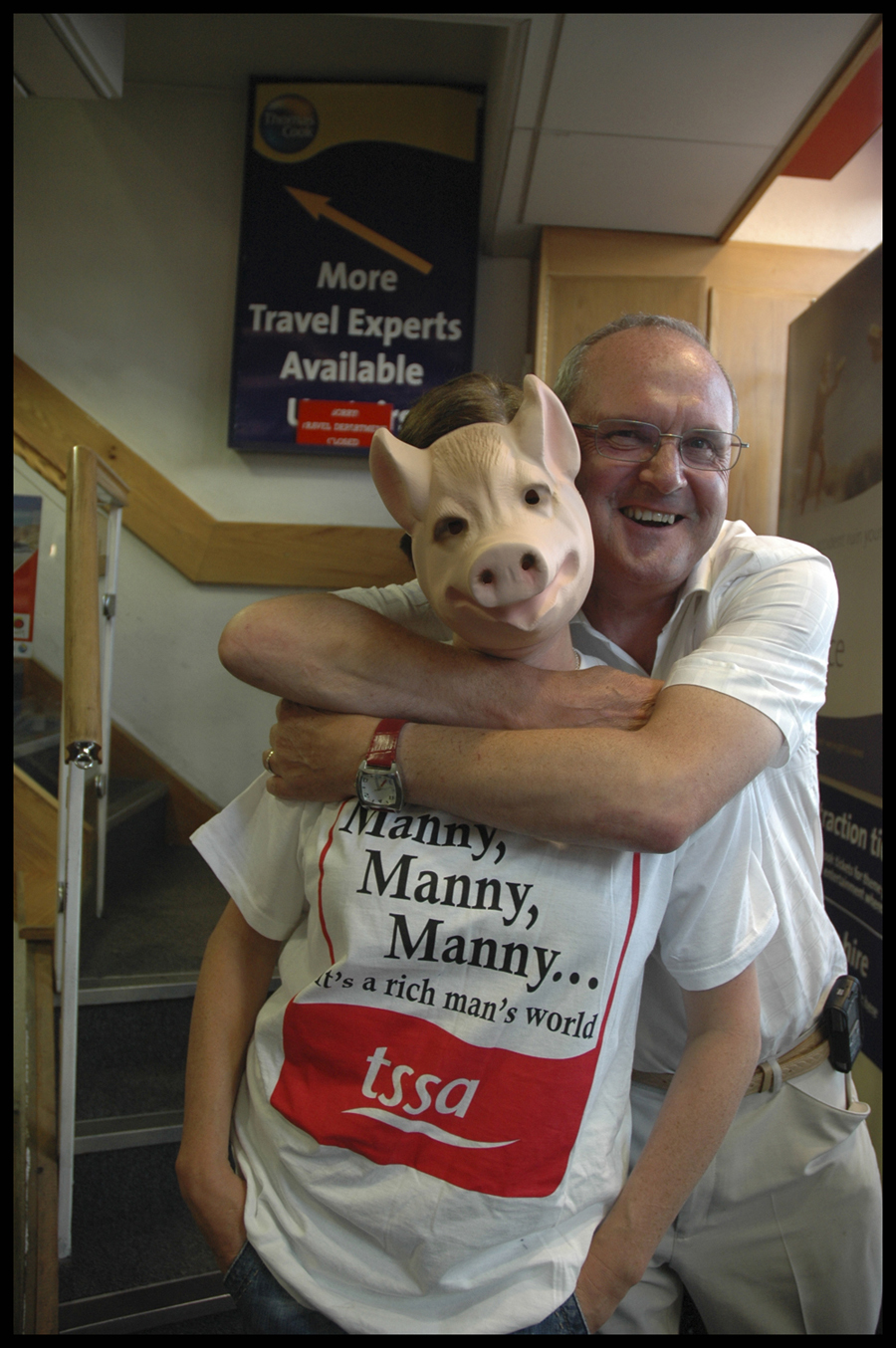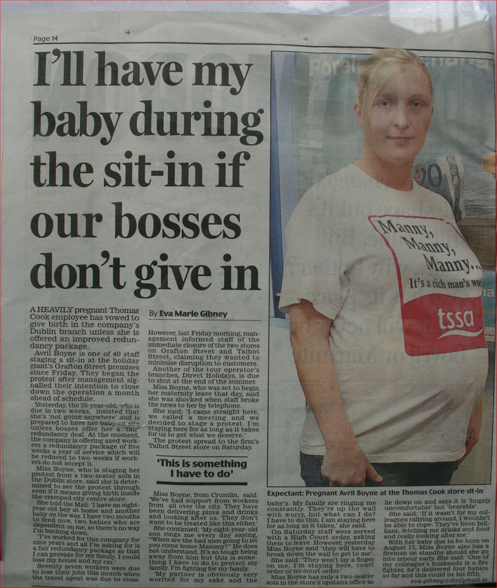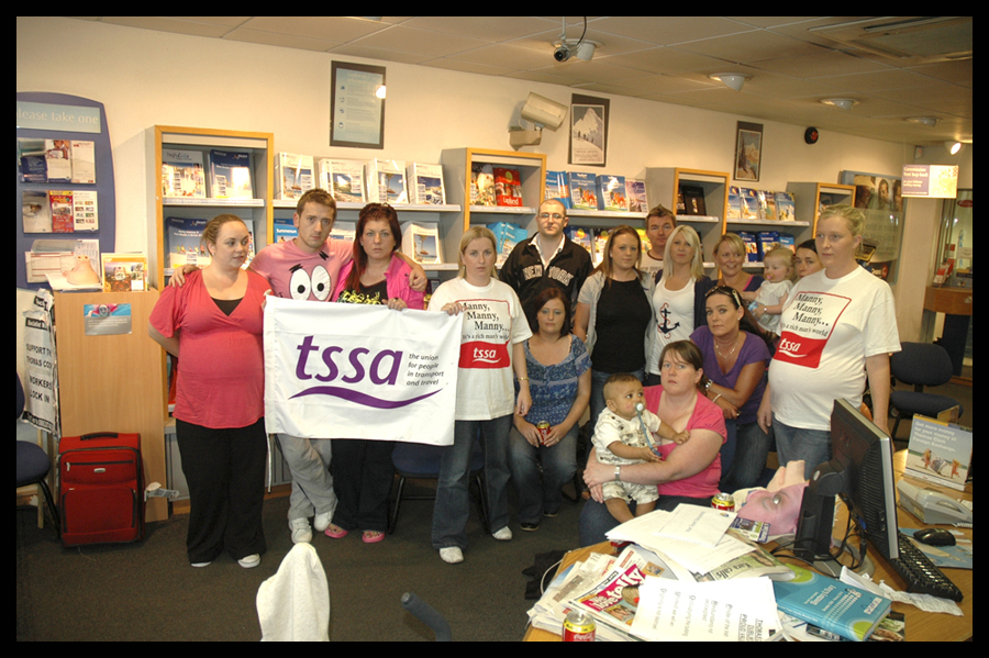 A press photographer arrived and the workers assembled in the shop with management beside them looking uneasy, one of the pregnant workers was having her photo taken when the press officer for thomas cook management tried to block the shot, one of the union members threw the press officer out of the shop, soon to be followed by the other managers, who left in tears. They had never had to deal with workers fighting back.They expected submission. The workers and supporters outside began shouting, 'the workers united will never be defeated!'.