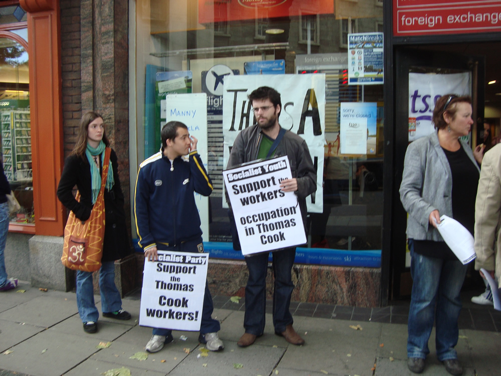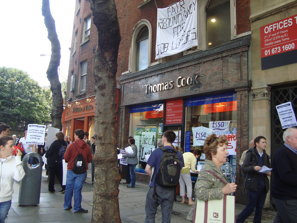 The Thomas Cook offices at grafton st dublin are now under worker's control. Workers occupoed the building after management , who had flown in specially from the UK, announced the closure of the shops on north earl street and grafton st Dublin. The staff at the north earl st shop were told to close the store for an hour and to accompany managers to the grafton st store, they went upstairs and started laying out chairs to line the workers up and dismiss them. One of the workers who sensed what was coming shouted 'Lock In!' and, like electricity, word shot up through the other floors of the building.