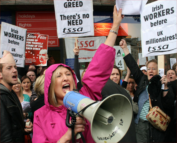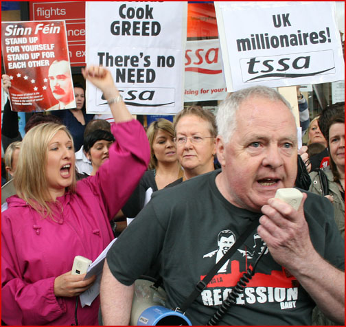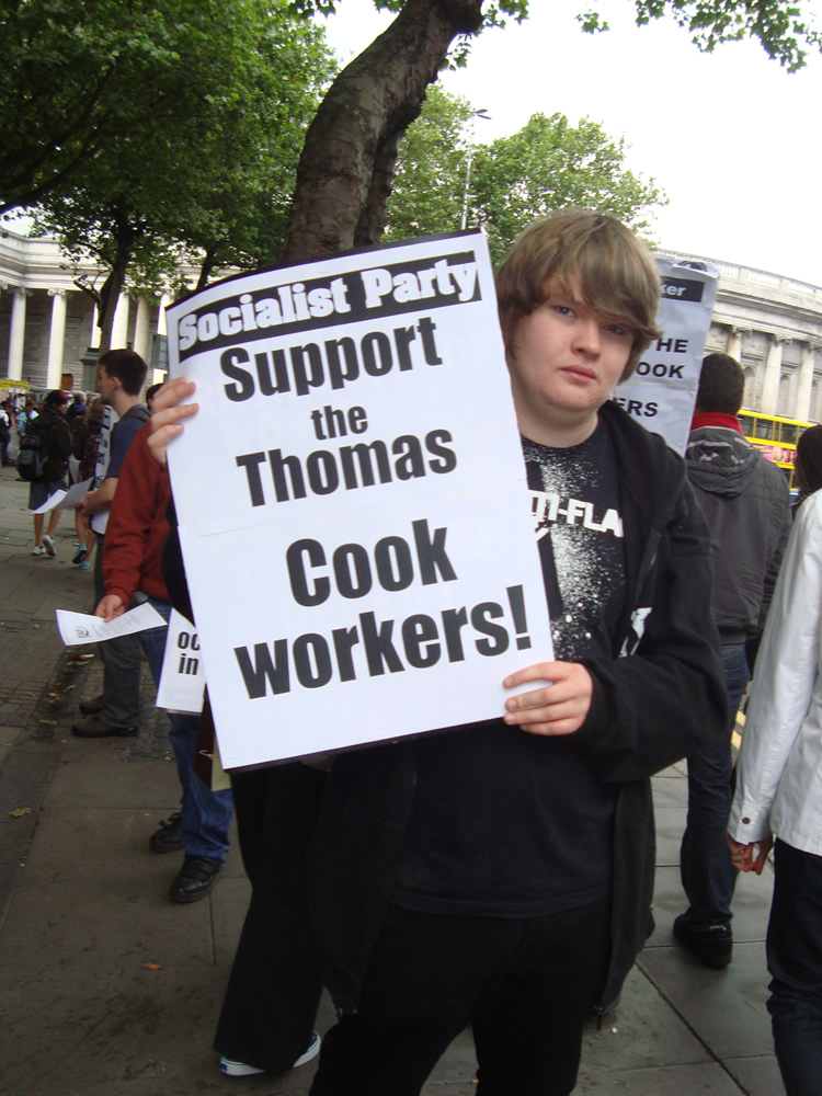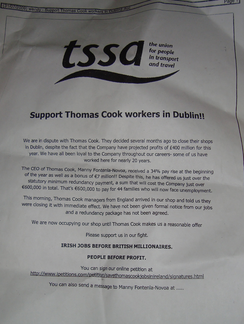 I agree 100% with Mick that the TSSA slogan 'Let's put Irish jobs before British millionaires' is shortsighted and wrong. There are no nationalist solutions to this present dispute. Instead we should advance an internationalist policy of uniting with Thomas Cook employees across Britain and Ireland to fight against branch closures and job-losses. Irish bosses are no better than their British counterparts. We need to point to the economic system - capitalism - that is plunging workers into poverty, unemployment and insecurity.