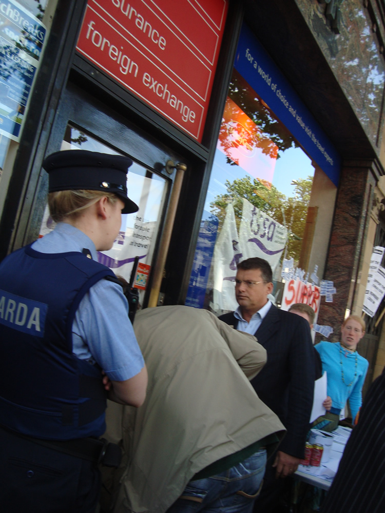 It's a disgrace that the Gardaí forcable put people on the Dole. All workers should show their disgust at this attack on Workers' Rights. Any news on the pregnant woman? I heard that she's gone into labour? Any developments on that? SP and SWP did good work over the past days. I heard Cllr Matt Waine and Cllr Richard Boyd-Barret were lifted with the workers.