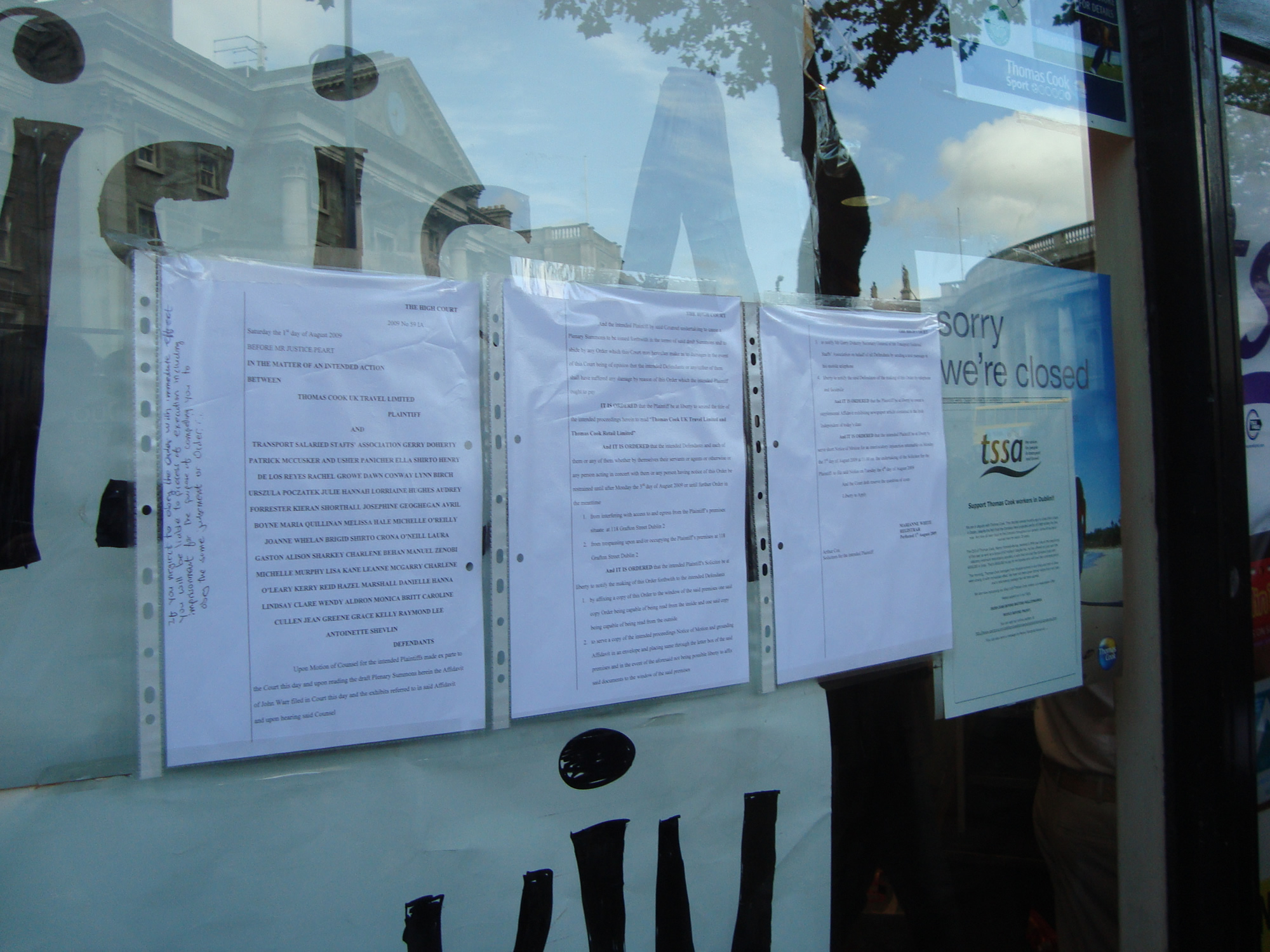 At eleven-o'clock staff at a second travel agent in Dublin began an accupation in support and solidarity. At the same time TSSA memebrs at Grafton street (the original store of the occupation) were threatened with high court action to evict us.
