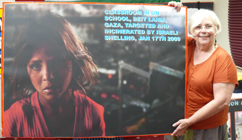 Susan Johnson told of an Israeli remote controlled machine gun tower in a Gazan farmers field that "opened like a flower" to spew death to all who strayed within its killing zone, told of the water sprinkler system still allowed to operate as a spendthrift of Gaza's precious water on the lawns of the American school, devastated by Israeli fire. Her words to a friend in an email captures the spirit of this feisty Philadelphia woman : My trip to Gaza was traumatic, I thought I was prepared for it, but wasn't. To describe the destruction properly I would need a new vocabulary. As one person told us, there aren't words for what they are going through. The effects of the siege are equally devastating. I hadn't realized how awful it is for Gaza ... The impact of my trip to Gaza is difficult to explain or describe. The situation there is beyond words. Gaza has left me traumatized, energized, exhausted and passionate ... When I found myself at home after the Gaza trip, I realized "myself" was gone and wouldn't be returning. It was beyond a life changing experience. I have a passion for the West Bank, Gaza and Palestinian Refugees I never thought possible http://vivagaza.org/