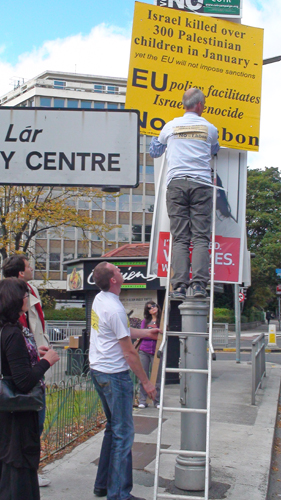 This overt and alarming attempt to suppress IFPAL's laudable attempt to shine a hard, cold and shaming light on Israel's frenzy of butchery in Gaza and beyond over the Xmas period, is not confined to the bailiwick of Donnybrook Garda Station, its carcinogenic tentacles extend much farther in Ireland , I'm afraid, it's just one of many: From Dublin City Corporation's removal of the IFPAL raft sign at the Ha'penny Bridge on the basis that they didn't like its "message" http://www.youtube.com/watch?v=PLhXfybD_4o to the wrongful arrest of an IFPAL activist in Galway by a compliant, idiot Guard at the command of Zionist Jews who were in high, malodorous dudgeon at the "lies" on the IFPAL sign http://www.youtube.com/watch?v=Ch9ORXw8ulw to Willie O'Dea, our manque "Dirty Harry" Minister of Defence who malevolently tried, in vain, to bully Limerick City Council into removing IFPAL's signs in Limerick City and environs on the basis that his office had received "many complaints" over IFPAL's contentions.