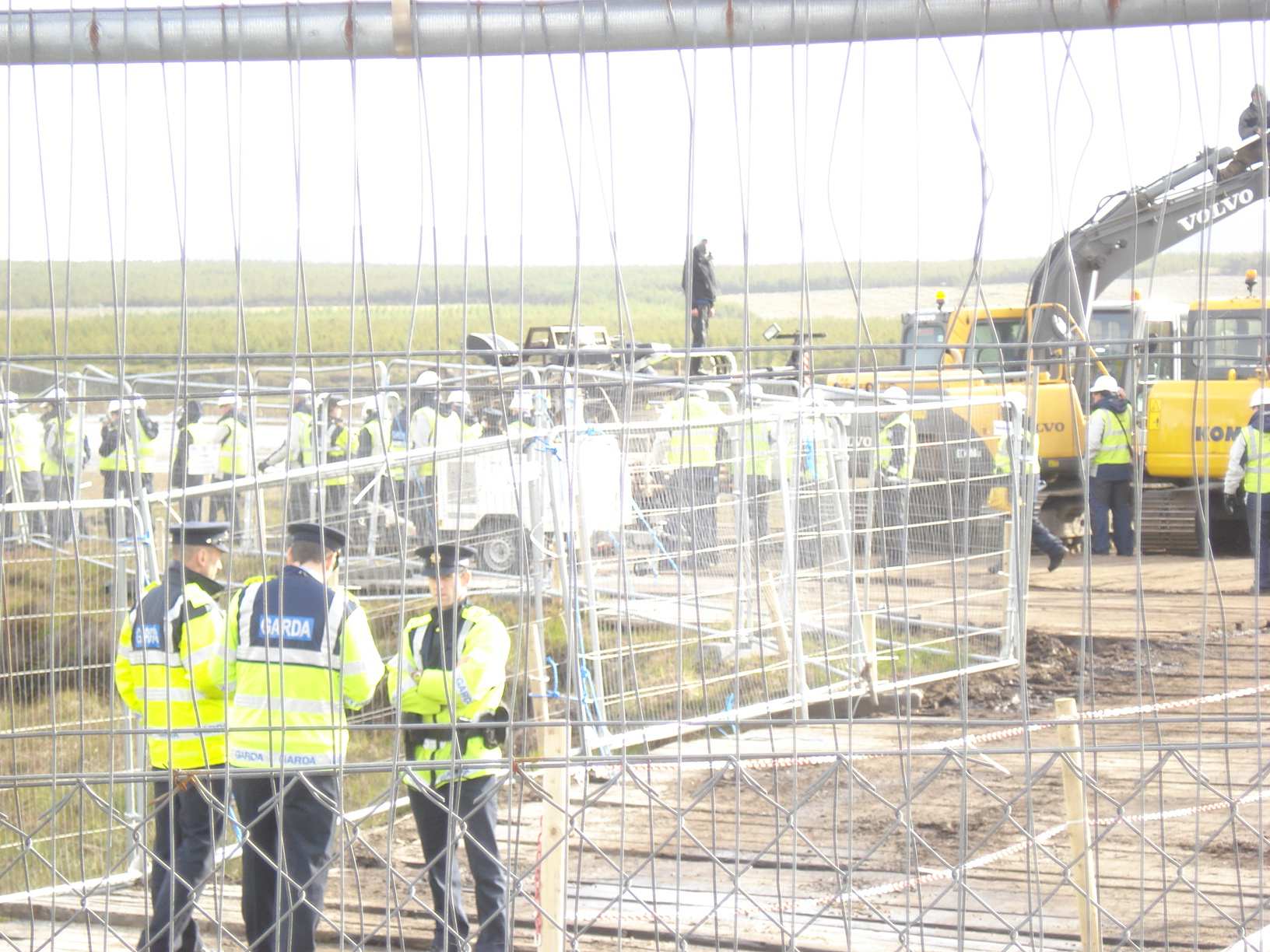 Yesterday, thirty activists, including an international presence, took the Shell compound at Aughoose where they are doing preparation work for the controversial pipeline that will run high pressure gas through communities in North Western Ireland. Three individuals managed to make it onto machinery while others closed the main gain with a lock-on. The result was no work done for the entire day. Five people were arrested, all of whom are now released though some have been charged.